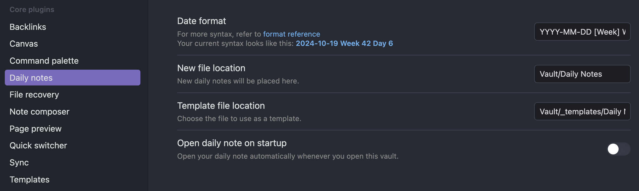 The Date Format sets the title of your daily note. You can click on the format reference to customize the note to your preference. Mine, for example, is: YYYY-MM-DD [Week] W [Day] d, which converts to: 2024-10-10 Week 42 Day 6:
